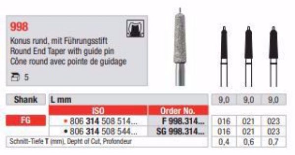 Diamant F998 FG 021, 5stk Konus rund med guide pin Fin rød ring