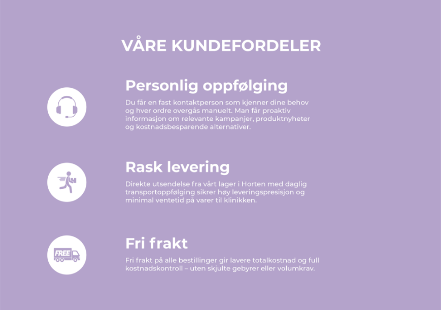 Vi stiller krav til leverandører, reduserer miljøbelastning i drift og transport, og utvikler løsninger som gjør det enklere for klinikker å ta mer miljøbevisste valg. Bærekraft er en integrert del av vår strategi – ikke et tillegg.