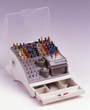 Rund med lokk, aluminium, grå. 6 rør for organisering av endofiler. Autoklaverbar.