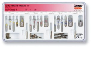 Pulpale titaniumstifter til plastiske opbygninger af rodfyldte tænder med stort substanstab, sæt nr. 3.